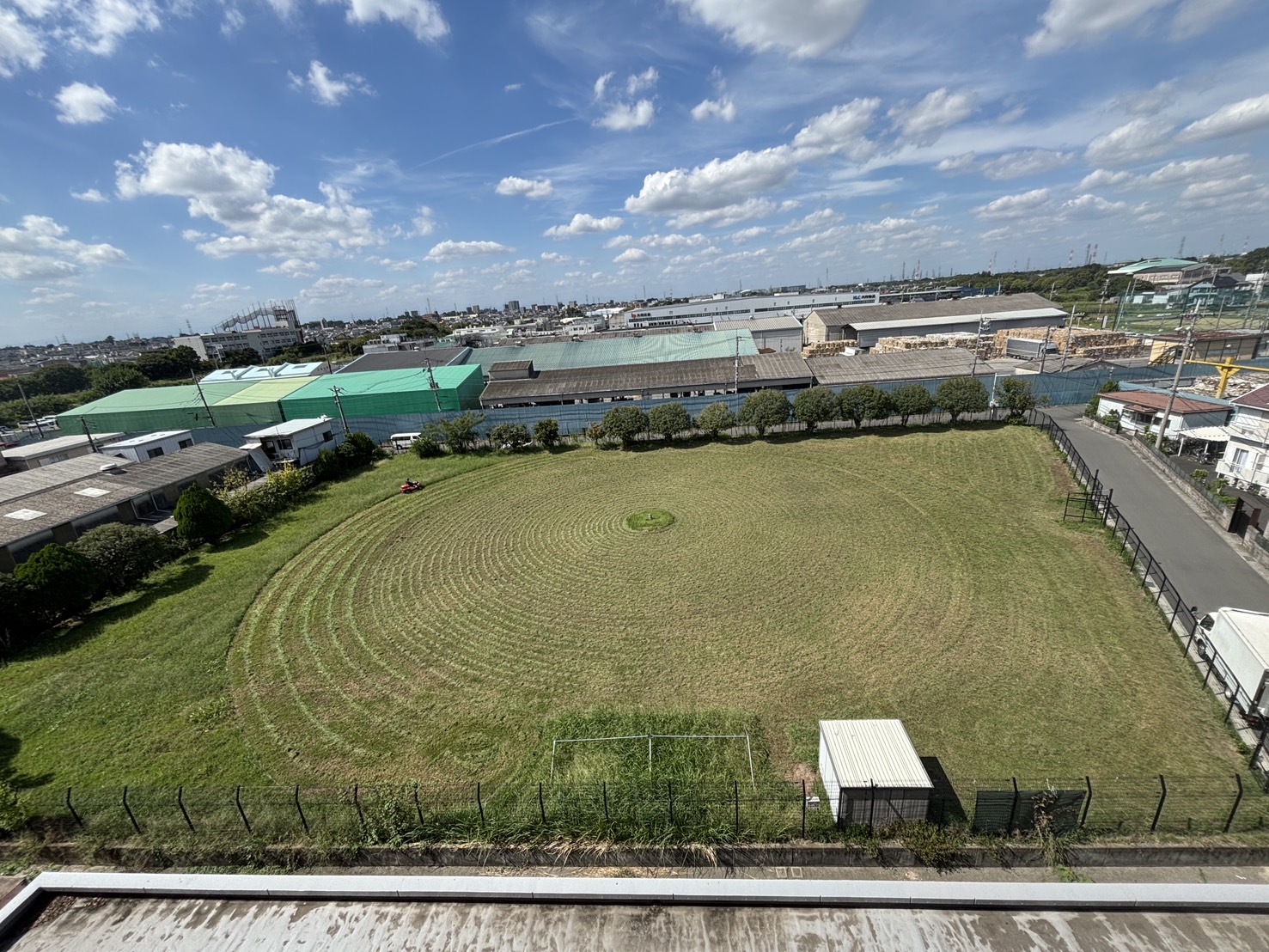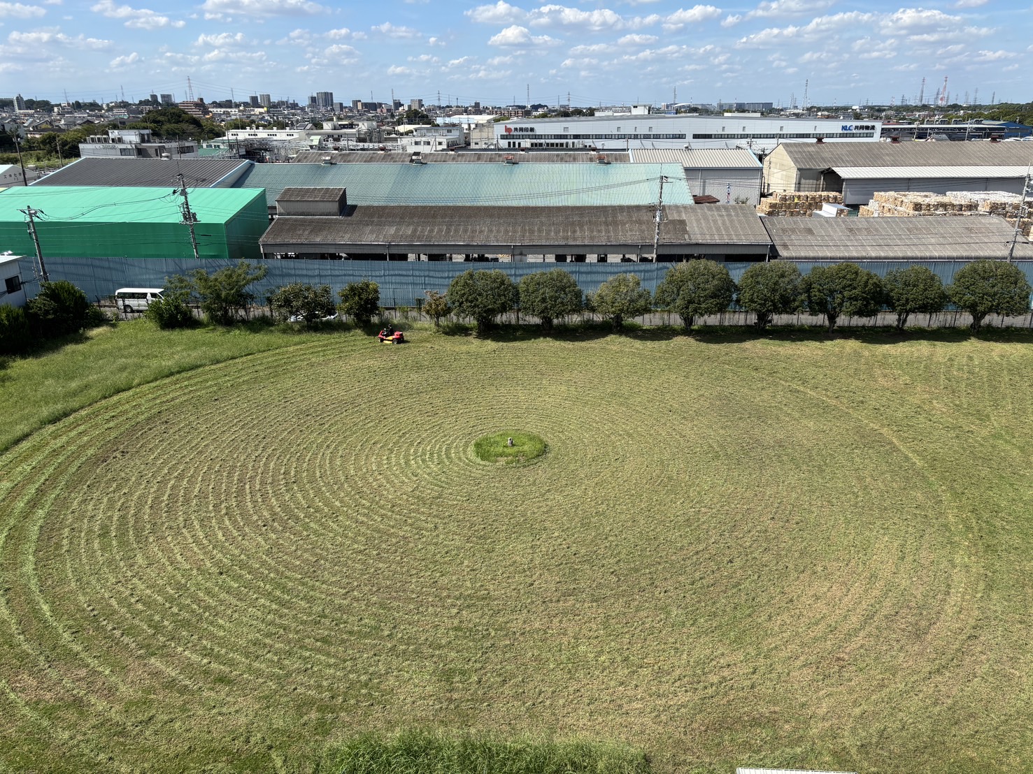 グランドに突如現れた幾何学の魔術師!乗車型草刈り機が描くは、円・円・円…まるで宇宙からのメッセージ。操縦者は無言の芸術家、タイヤは筆、草はキャンバス。工場の屋根も嫉妬するほどの造形美に。これは草刈りではなく緑のアート作品完成となりました!